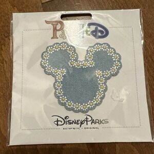 This product is a brand new patched Mickey Mouse head icon patch featuring a blue denim design with daisies. The patch is themed after Walt Disney World's Mickey Mouse character and is part of the Disney franchise. It is a set collectible perfect for fans of Disney and Disneyana. This patch is a unique and eye-catching addition to any pin, patch, or button collection, especially for those who have visited or are fans of Walt Disney World.