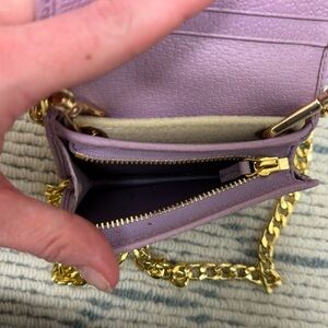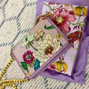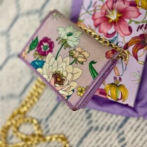 GUCCI Limited Edition Lavender Floral Feminine Bi-Fold Wallet W/ Added Faux Gold Chain Crossbody