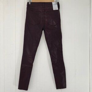 * Button Closure, High Rise, Fitted, Straight Leg, Ankle Length, Coated Denim, Faux Leather Look, Back Pockets, Raw Hem