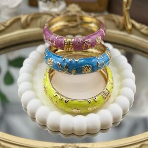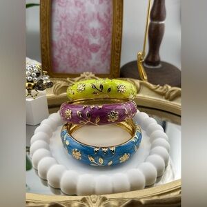 Add a pop of color to your outfit with this vibrant enamel bangle. Featuring shades of purple, blue, and yellow, these bangles are perfect for any occasion.