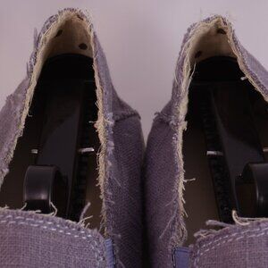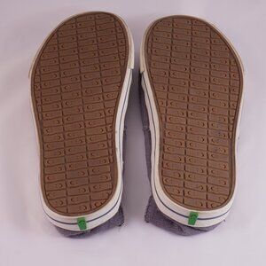 Good pre-owned condition with normal light wear. Frayed edges are part of the original Sanuk design and not a flaw. Soles show moderate wear with good tread remaining. Clean and structurally solid.