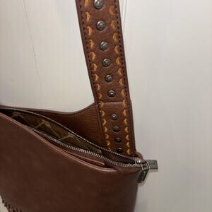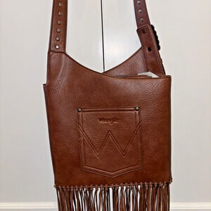 Wrangler Brown Faux Leather Shoulder Purse Bag Long Fringe Turquoise Stud Strap