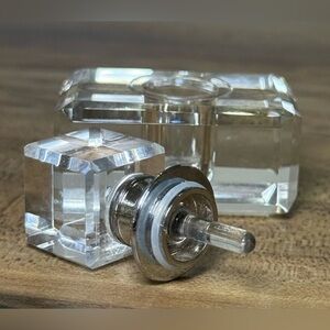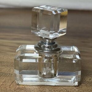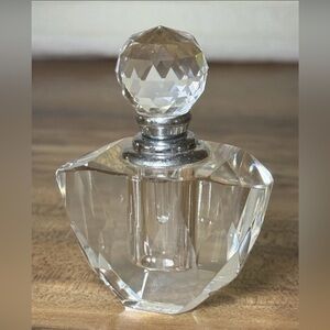This lot of three Saks Fifth Ave crystal cut perfume bottles (2.25-2.85" tall) features elegant geometric faceting with clear cut crystal toppers. Two of the bottles come with a screw-in dauber adding a modern and sleek touch to your vanity or display. These collectible pieces are perfect for adding a touch of sophistication to any space, whether for decorative purposes or for holding your favorite perfumes. Each bottle has a Saks Fifth Avenue lasered signature on the bottom. No chips, flea bites or cracks. Excellent condition. Rare !!!