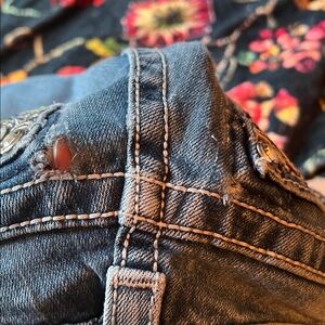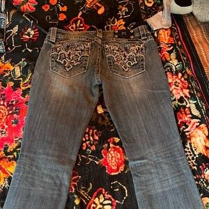 Hemmed to 32. Small spot of stitch in hem coming undone but not bad. Miss me bling pocket. Repair done by back pocket. 2 small holes starting by back pocket. Price reflects condition. Still has life left. No stains.