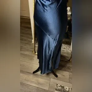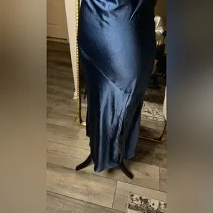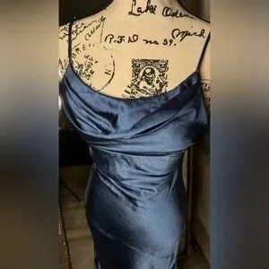 Chic midi dress with a sleek silhouette. Features a cowl neckline and thin straps. Perfect for evening wear.
