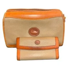 This vintage Dooney & Bourke set features a "Classic Zip Top" crossbody bag and a matching pebbled leather wallet, both part of the iconic All Weather Leather (AWL) collection from the 1980s and 1990s. This line is known for its durable, water-resistant pebbled leather and smooth "British Tan" leather trim.