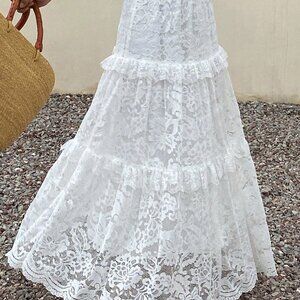 Elevate your vacation style with this white lace ruffle hem skirt, featuring an elegant design, casual fit, and flared silhouette for a natural waist look.