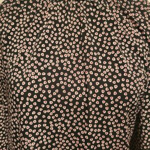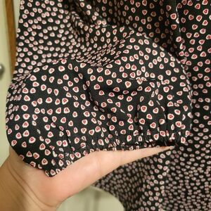 Super cute and stretchy Adrianna Papell heart print long sleeve blouse. Has ruffle neck and elastic cuffs.