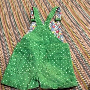 HARD TO FIND! Charming green overalls with a playful frog design. Features dotted pattern and floral straps.