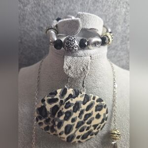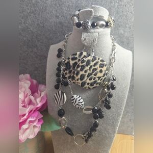 Leopard Print and Black Beaded Necklace Jewelry Set