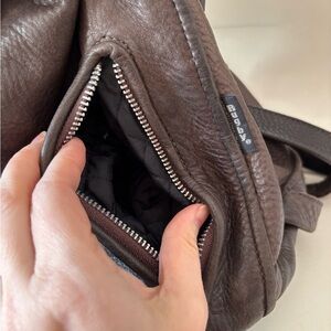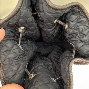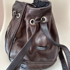 Rugby North America is now known as m0581. High quality - made to last! The unisex style is versatile, with adjustable straps. Rich dark brown pebbled leather. Drawstring bucket bag style with black quilted lining (no stains). Practical zippered pockets. Silver hardware. This bag is in great vintage condition; no tears or smells.