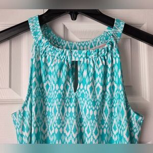 Stylish turquoise sleeveless dress with a unique pattern. Perfect for summer outings.