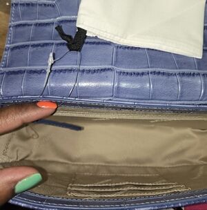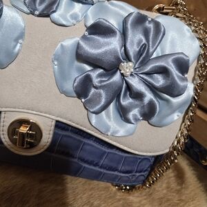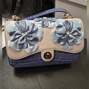 Brand new with tags. Part of Brahmins exclusive Premier Collection. Shoulder/Crossbody strap is leather and metal. Comes with dustbag. This elegant women's bag features a stunning blue floral design, perfect for adding a touch of sophistication to any outfit. The intricate flower details and rich blue color make it a standout accessory.