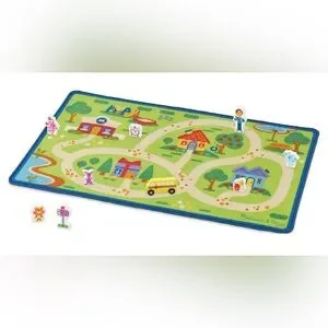 Colorful play mat with roads and buildings. Encourages imaginative play. Rug measures 44 in x 26 in (112 cm x 66 cm); skid-proof backing; reinforced border binding; machine washable, with blues clues characters