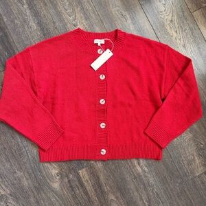Bright red cardigan with button-up front. The material is soft. Slight loose fit.
