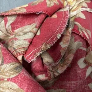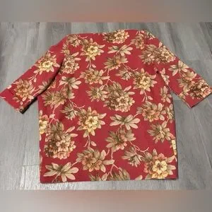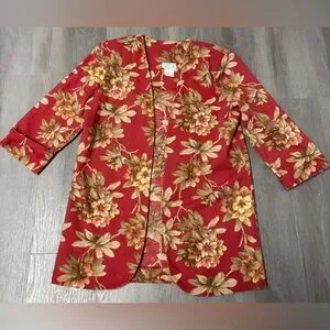 Stylish open front jacket with a vibrant floral pattern. Features red and brown hues. Does have padding in the shoulders. Unsure of actual size. See measurements.