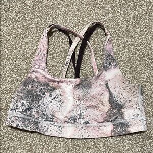 Stylish sports bra with a pink and black pattern. Features cross-back straps for support. Very comfortable and worn many times! Preloved but no visible signs of wear.