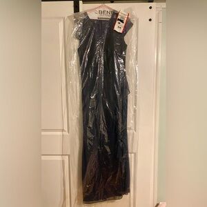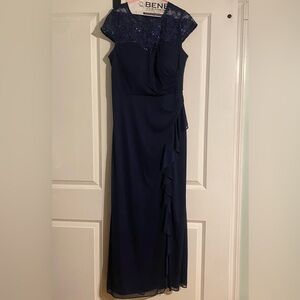 Chic navy maxi dress long gown with lace accents. Perfect for formal events or mother of the bride.