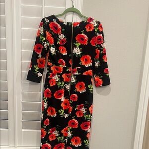 Chic black dress with striking red floral print. Long sleeves for added elegance. Extremely flattering.