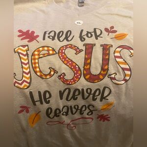 Light gray V-neck tee from Next Level Apparel. Soft and comfortable fabric. This Christian-themed graphic t-shirt is a popular seasonal item for fall and Thanksgiving, typically featuring the phrase "Fall for Jesus He never leaves".