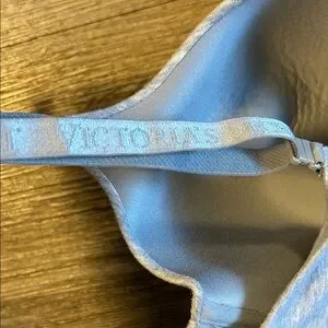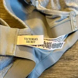 Gray Victoria’s Secret lightly lined T-shirt bra featuring a sparkling VS logo detail at the center band. Smooth cups make it perfect under everyday clothing while still having a subtle glam touch.