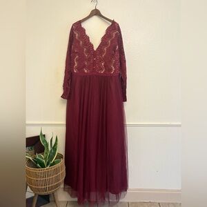 Chic burgundy dress with lace details. Long sleeves and elegant design. Perfect for evening events.