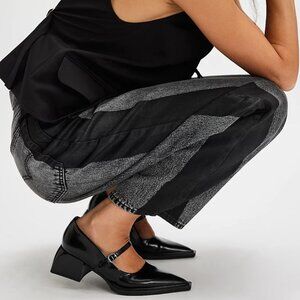 Multicolor, gray wash denim with coated black tuxedo stripe along legs