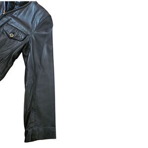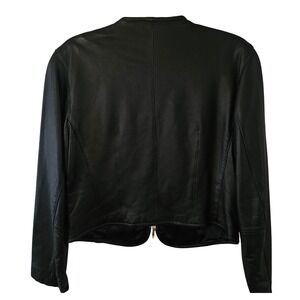 Lizwear Womens Black Leather Jacket Collarless Zip Front Gold Hardware Size M