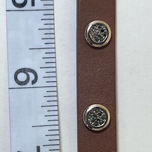 Stylish tan leather choker. Features gold stud accents with rhinestones. 16 inches long with two snap closures to make it shorter if needed.