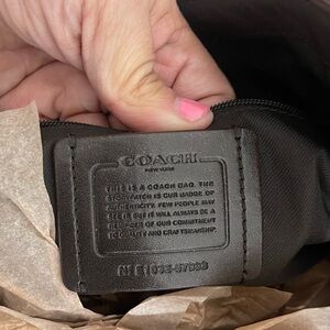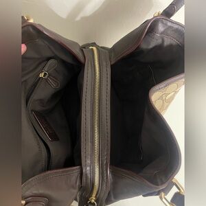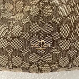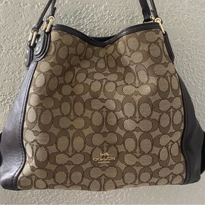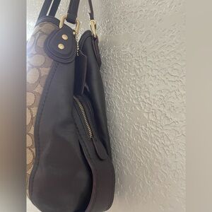 Elegant Coach shoulder bag with signature pattern. Brown and black design. Ideal for everyday use.