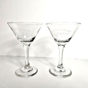 The product is a set of 2 Gentleman Jack stemmed martini glasses etched with Jack Daniel's branding. These elegant clear glasses with white etching are perfect for entertaining guests or enjoying a relaxing drink. The distillery theme adds a touch of sophistication and uniqueness to your home bar. Cheers to good taste with these original and stylish martini glasses. Very good condition with no breaks, cracks, chips noted.