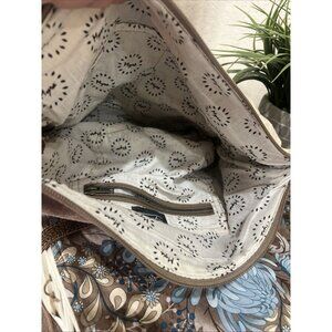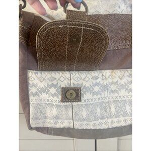 The Myra Bag Tribe Strip Upcycled Canvas & Leather Aztec Crossbody Shoulder Purse is a stylish and versatile accessory for women. Made from canvas with geometric Aztec patterns, this medium-sized shoulder bag features a grey exterior color with gunmetal hardware accents. It has a zip and snap closure, a brown canvas handle/strap, and a leather lining in beige. The detachable strap adds convenience for crossbody use, making it a practical yet trendy choice for any outfit.