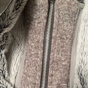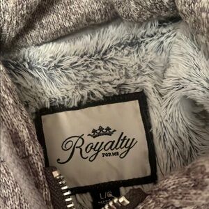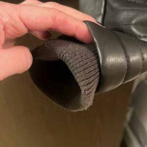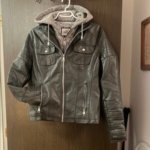 Stylish faux leather jacket with a cozy hood. Features zippered pockets and quilted details. Perfect for a chic look.