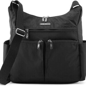 Features: Sleek, lightweight nylon crossbody with a secure RFID-blocking zipper pocket to protect your info. Cushioned adjustable strap for comfy all-day wear. Inside includes a key ring fob, credit card slots, and extra pockets for organization. Versatile style that can switch from on-the-go handbag to diaper bag or travel companion.