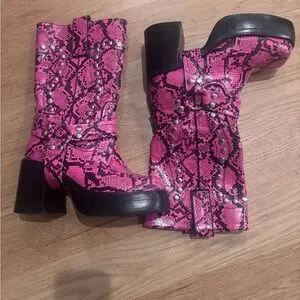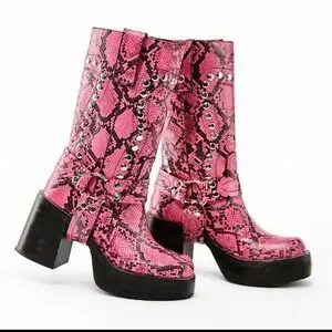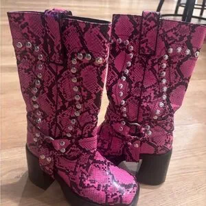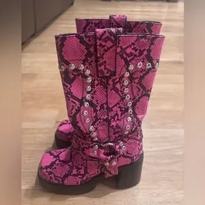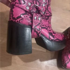 Bold pink snakeskin platform ankle boots in women’s size 8. Features an edgy studded design with adjustable strap detailing, a chunky block heel, and a platform sole for added height and comfort. Statement boots that elevate any outfit — perfect for concerts, festivals, nights out, or edgy everyday looks.