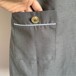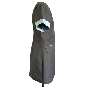 Gray tunic top / mini dress by Saint Laurent with gold tone, metal logo and 2-front patch pockets at thighs. Material feels twill suiting and baby blue lining feels like silk satin. Made out of 100% cotton in Italy. 🇮🇹