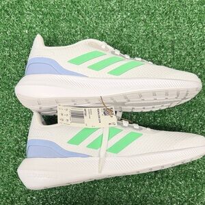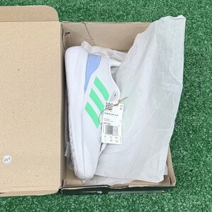 Stylish Adidas sneakers with a white base. Green stripes add a vibrant touch. Perfect for athletic activities.