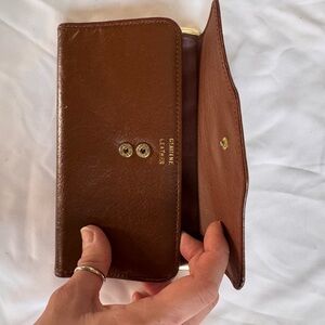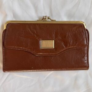 Elegant brown leather clutch wallet with gold accents. Perfect for any occasion.