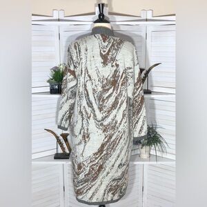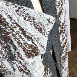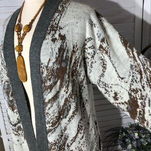 Vintage 90s full-length cardigan by Ashleigh Morgan in a Southwestern-style gray and brown pattern on a cream background. Size XL. Made in the USA.