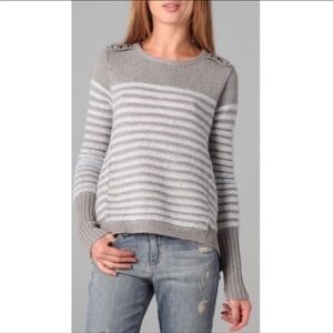 Stylish gray sweater with horizontal stripes. Features button details on shoulders. Perfect for casual outings.
