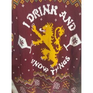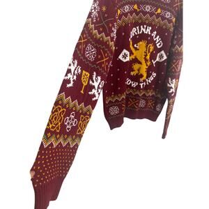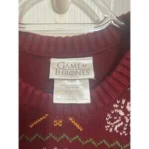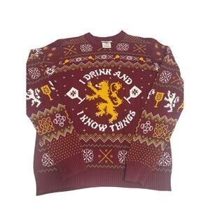 Step into the world of Westeros with this fantastic Game of Thrones men's dark red knit pullover sweater! This cozy and stylish sweater is perfect for any fan of the epic fantasy series, or for anyone who appreciates a touch of medieval-inspired fashion. Crafted from a soft, comfortable knit, it's ideal for keeping warm on cooler days or adding a distinctive layer to your outfit. The rich dark red hue evokes the colors of powerful houses, making it a true statement piece. Whether you're attending a fan event, enjoying a casual day out, or simply lounging at home, this pullover offers both comfort and a unique sense of style. It's in excellent pre-owned condition, ready for its next adventure with you. Embrace your inner noble or warrior with this awesome sweater!.