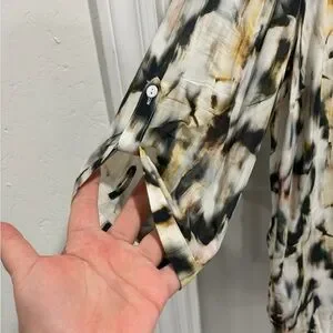 Trendy Women's Abstract Print Blouse with Half Button-Up Front and Roll-Up Tabs