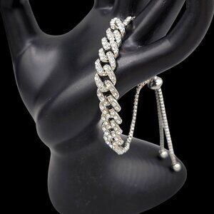 Elegant silver tone bracelet with encrusted rhinestones and a flat link design, featuring an adjustable bolo clasp for a comfortable fit. Perfect for adding a touch of sparkle to any outfit.