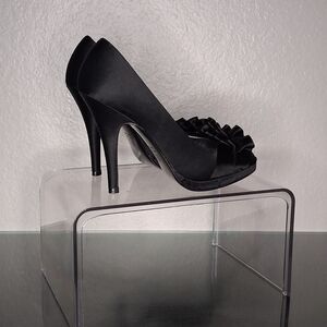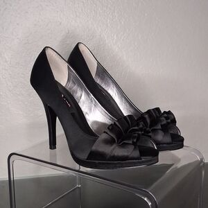 Nina New York Black Satin Ruffle "Fulvia" Open Toe Heels