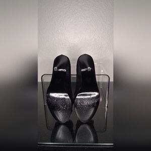 Black matte Satin Upper, open toe, with ruffle across toes.