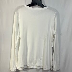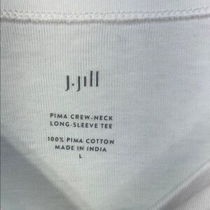 This cream long sleeve tee from J. Jill features a fitted silhouette, perfect for a sleek and polished look. Made from a soft, breathable fabric, it ensures comfort throughout the day. Ideal for layering or wearing on its own, this top is a versatile addition to any wardrobe. Great preowned condition. 100% Pima cotton. Shirttail hem line. Super soft high-quality cotton knit. Chest 42 inches. Length 26 inches.