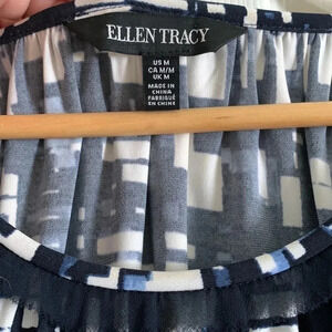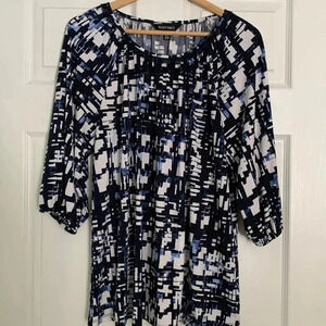 Navy, light blue and white patterned Tunic, 3/4 sleeves. Cute navy ruffle detail along neckline. Flattering roushing and flowy fabric. A generous size Medium.