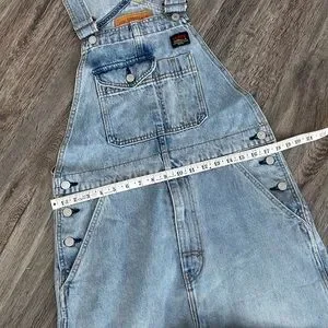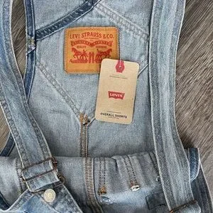 This is a pair of Levi's denim overall shorts with adjustable straps, a bib pocket, and side pockets.
