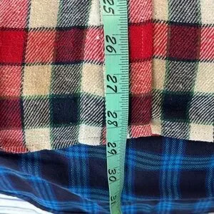 Pattern: Features a traditional multi-colored plaid (red, navy, and cream) with a single diagonal-patterned chest pocket.