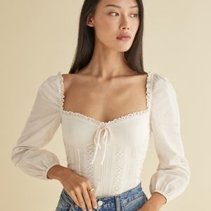 The Isadora is fitted in the bodice with a looser fitting sleeve to give you a little extra room. It has elastic at the sleeve opening and lace trim for a more romantic fit and feel.